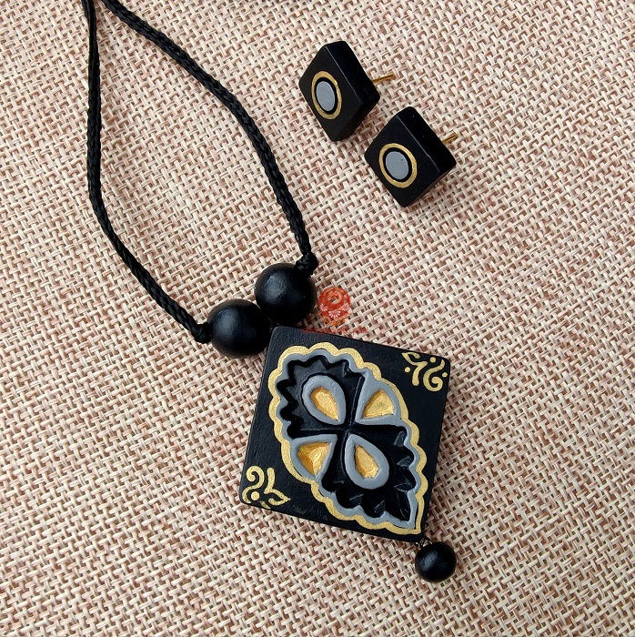 Terracotta small set in black, grey and gold. Comes with matching earrings. These Terracotta minis are just perfect for everyday jewellery. Colorful, light weight & pocket friendly.