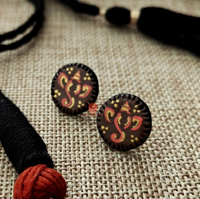 'Brown and peachy orange fusion' - Handpainted Terracotta Set. This set adorns the colours of earthy brown and peachy orange with a line drawing of Ganesha in the center of the pendant. This fusion set combines clay, thread, wooden and Rudraksh beads aesthetically.
