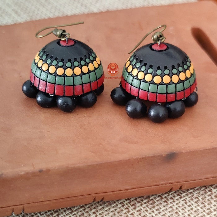 Terracotta Festive jhumkas in black, coral red, yellow and green.