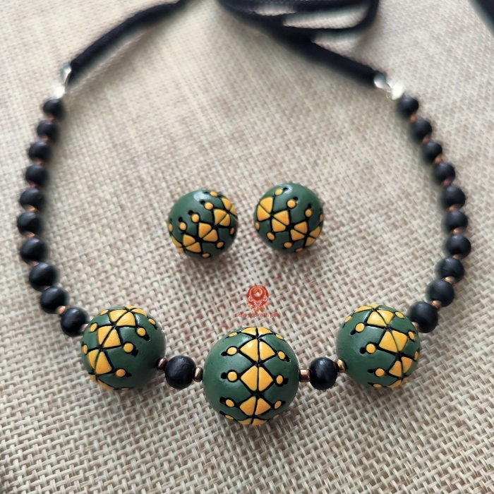 Daily wear beaded choker in green and yellow - Terracotta Set