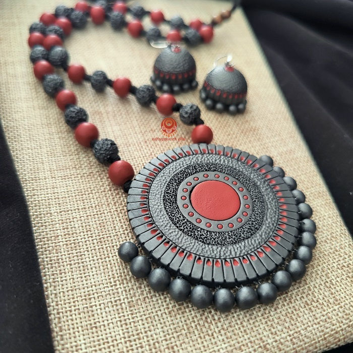 'Dhwani' - Terracotta Jewellery set in antique silver and deep maroonish red. This set has been assembled with textured terracotta beads. Comes with matching jhumkas.
