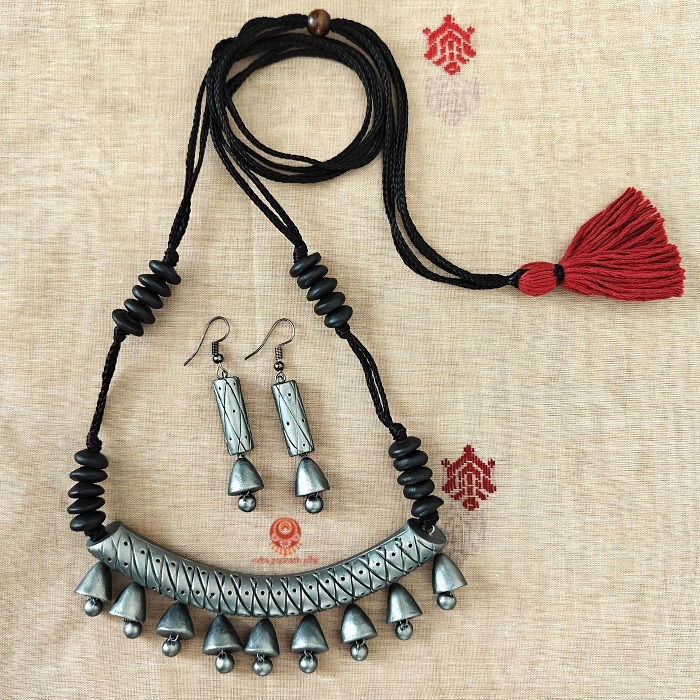 This unique and stylish set with it's arch shape pendant and criss-cross design with a silvery shade that probably goes with Indian & Indo western styles is a must have piece in your wardrobe.