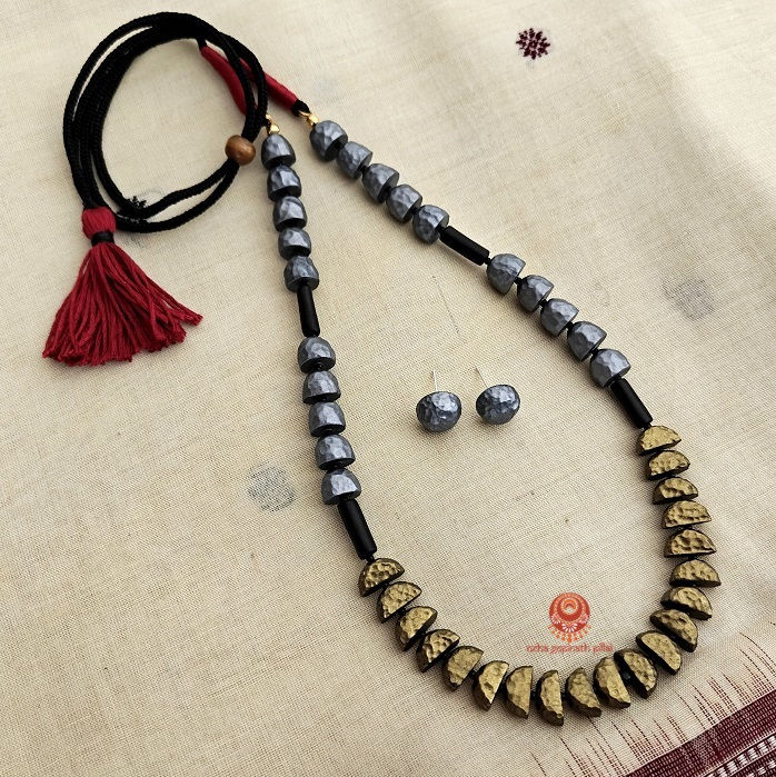A uniquely designed textured beaded set in antique gold and antique silver. This set comes with matching stud earrings.