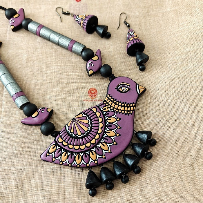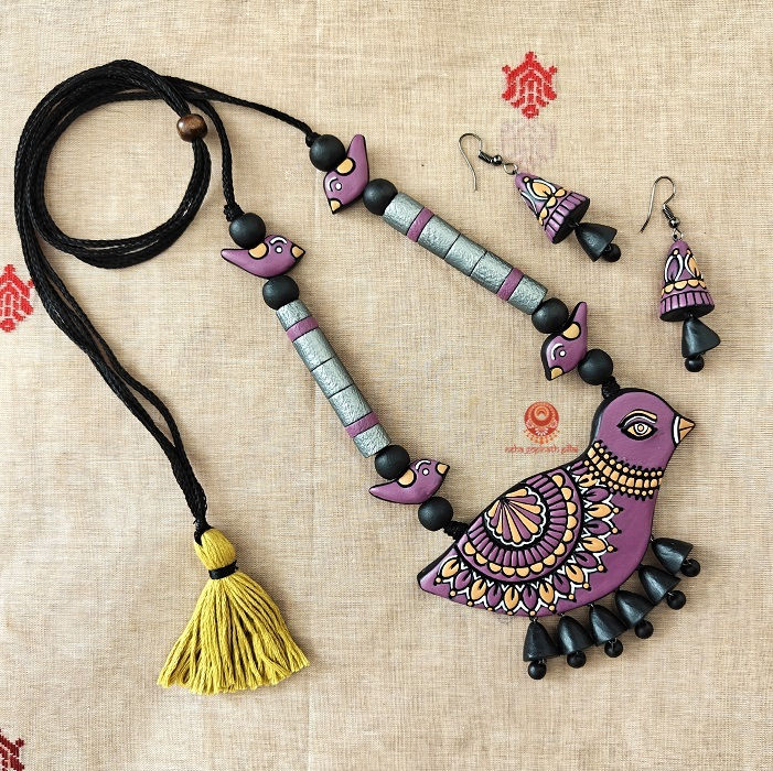 This beautiful handcrafted set with intricate details in purple, yellow, white, silver and black. This festive neckpiece comes with matching jhumkas.