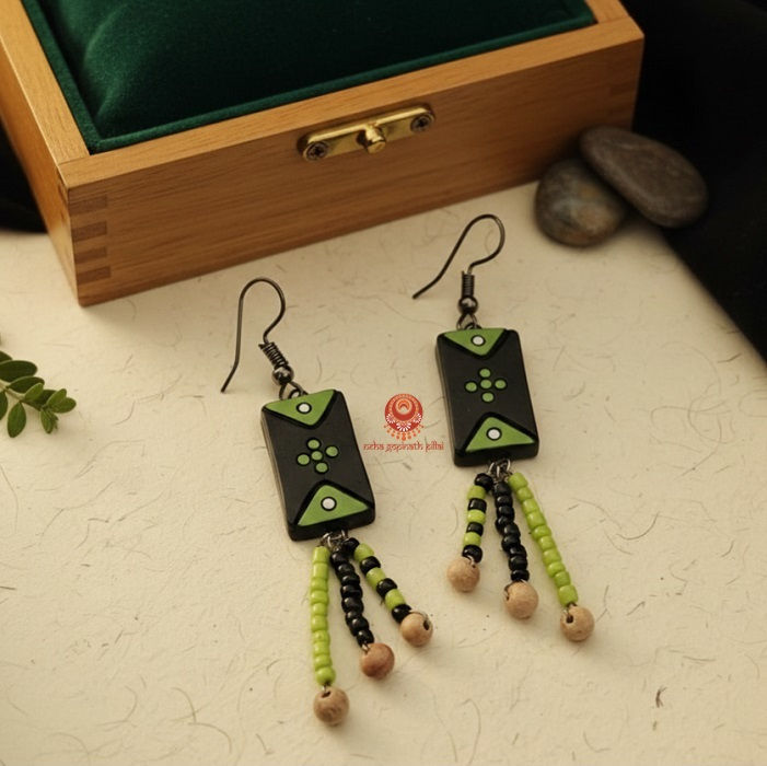 These exquisite dangle earrings are a harmonious blend of rustic charm and vibrant elegance. Delicate dangles from the bottom of the main terracotta rectangular piece, consisting of colorful seed beads adding movement and a bohemian flair to the overall design.