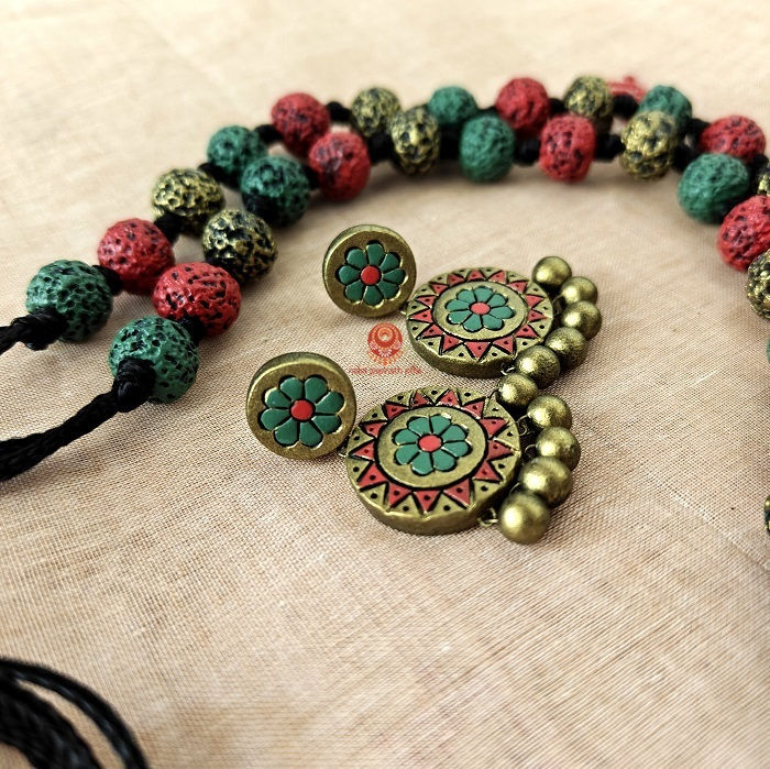 An antique gold set with intricate designs and traditional colours of maroonish red and green. This beautiful set comes with matching Jhumkas.