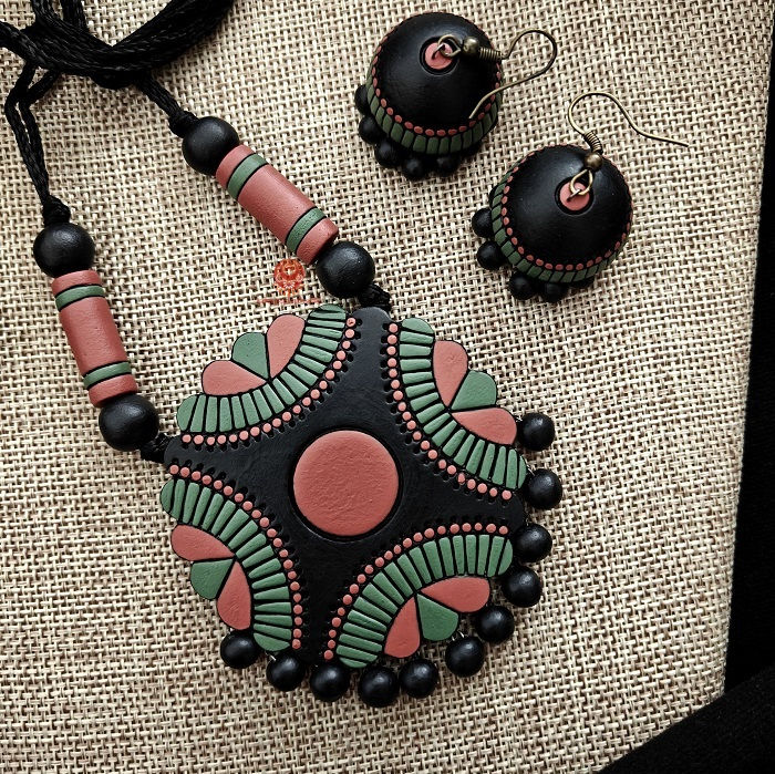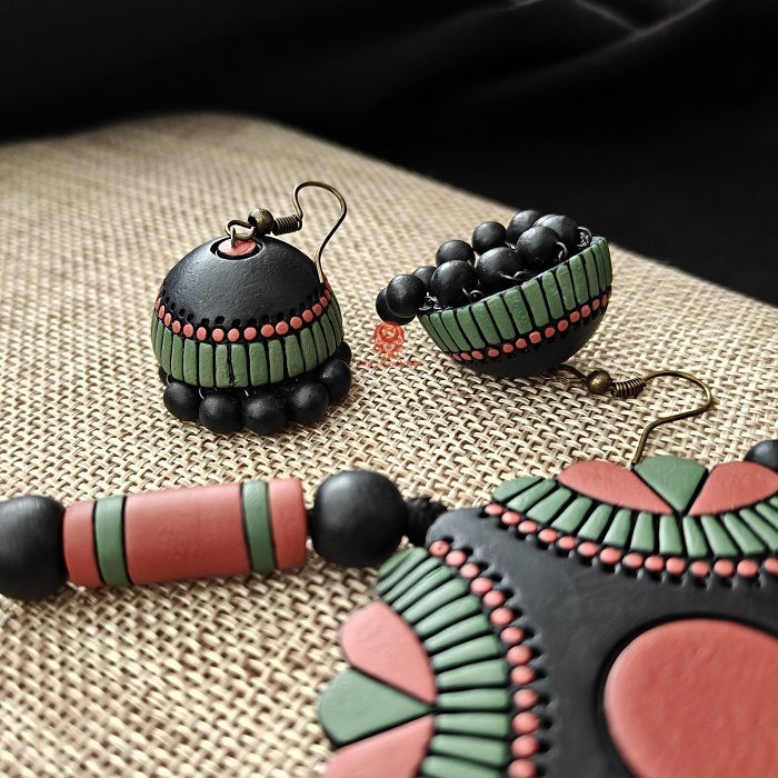 Adorning beatufiul terracotta and green colours this set is assembled on an adjustable cord with beads. Comes with matching jhumkas.
