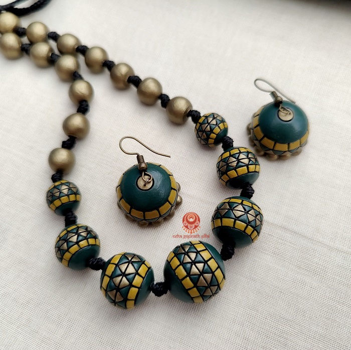 Terracotta jewellery for every occasion. This beautiful beaded set in black, hunter green, yellow ochre and antique gold. Comes with matching jhumkas.