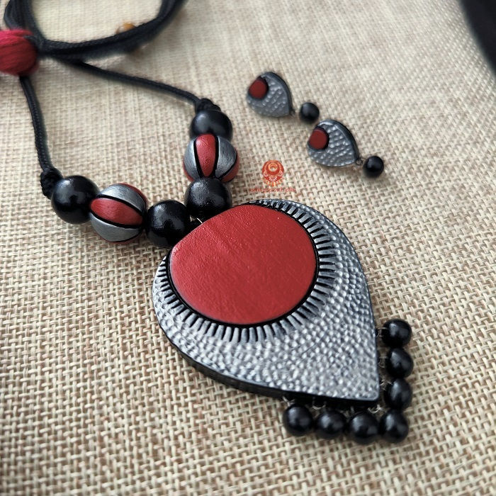 'Vandana' - Terracotta daily wear set in black, deep maroonish red and antique silver. This set has been assembled on an adjustable cord and comes with matching cute little studs.